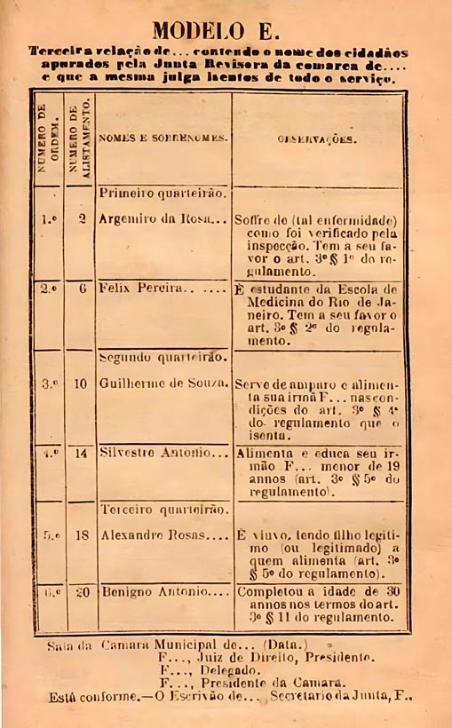 No caso dos ricos, a dispensa ocorria porque as leis do Império não exigiam o serviço militar dos jovens que estudavam ou se dedicavam a determinados tipos de trabalho formal. Eles também tinham a possibilidade de pagar uma quantia em dinheiro ao governo para se livrarem do recrutamento.
