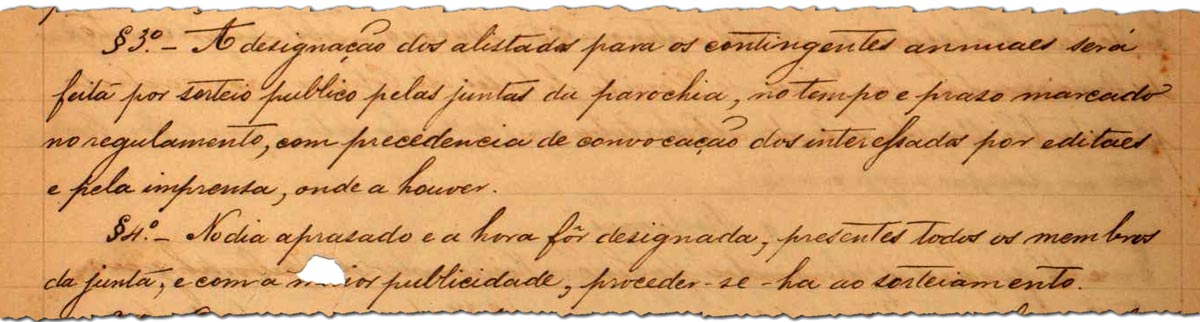 Trecho do projeto que deu origem à lei de 1874: “A designação dos alistados para os contingentes anuais será feita por sorteio público pelas juntas da paróquia”