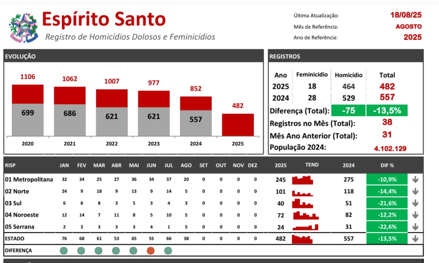 A média estadual é de 13,5% de redução de homicídios neste ano em relação ao mesmo período de 2024. Foram 482 homicídios em 230 dias,  apontando para uma taxa de 18,64 homicídios por 100 mil habitantes ao final de 2025.