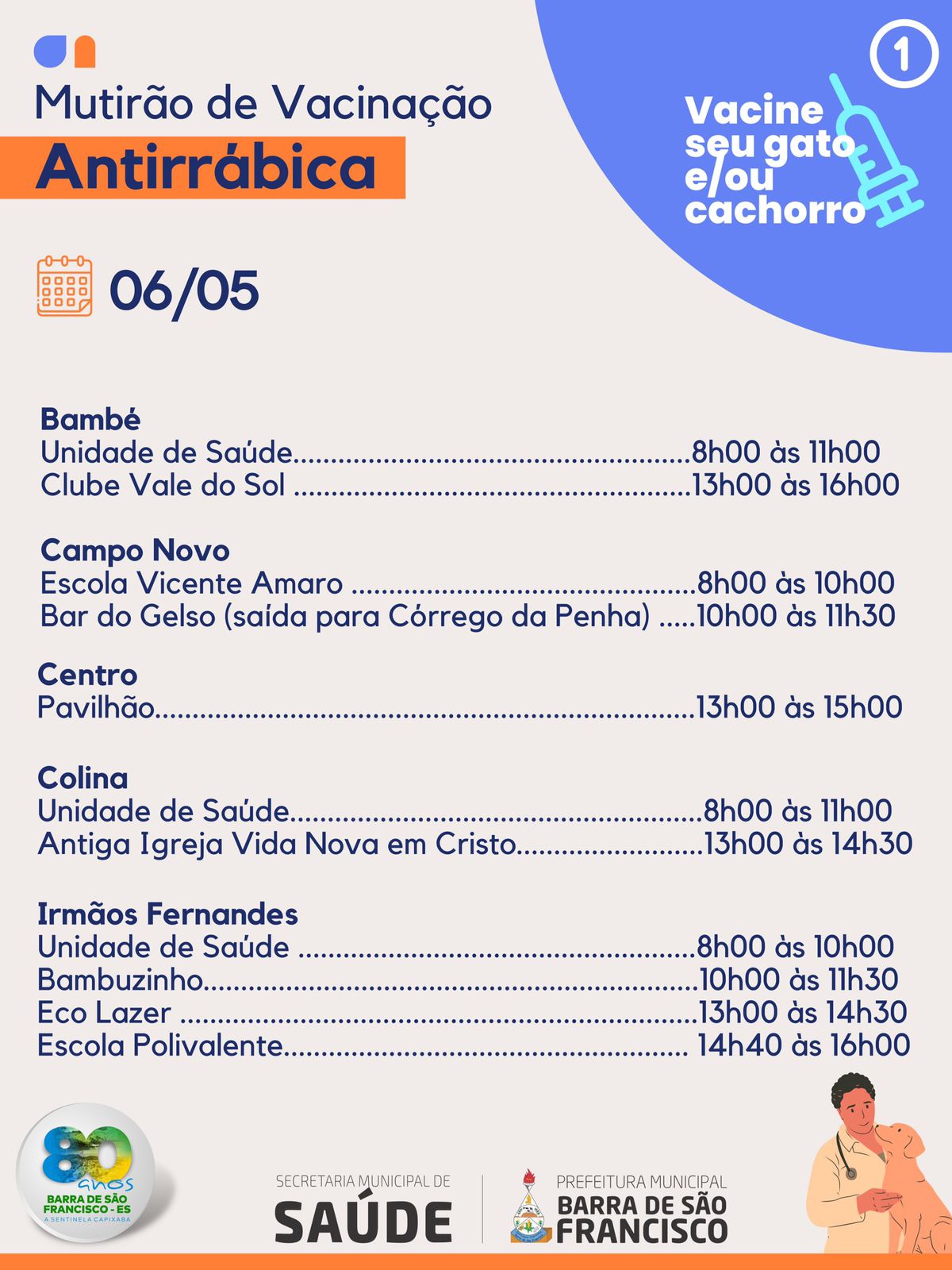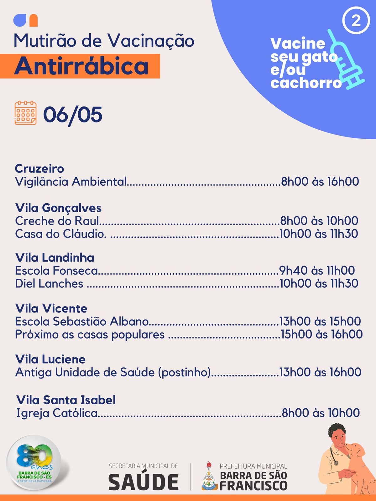De acordo com o secretário municipal de Saúde, Elcimar de Souza Alves e a coordenadora da Vigilância Ambiental em Saúde, Patrícia Moura, a vacinação prossegue na região de divisa com Minas Gerais até o dia 6 de maio, quando será realizado um Mutirão de vacinação contra a raiva em todo o município.