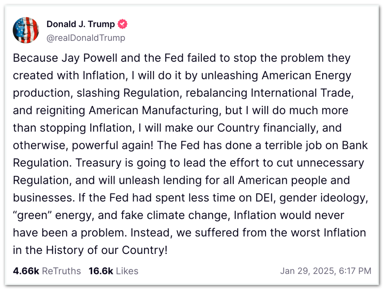 “Se o Fed tivesse gasto menos tempo em DEI [diversidade, equidade e inclusão], ideologia de gênero, energia ‘verde’ e falsa mudança climática, a inflação nunca teria sido um problema. Em vez disso, sofremos com a pior inflação da história do nosso país!”, escreveu o presidente.