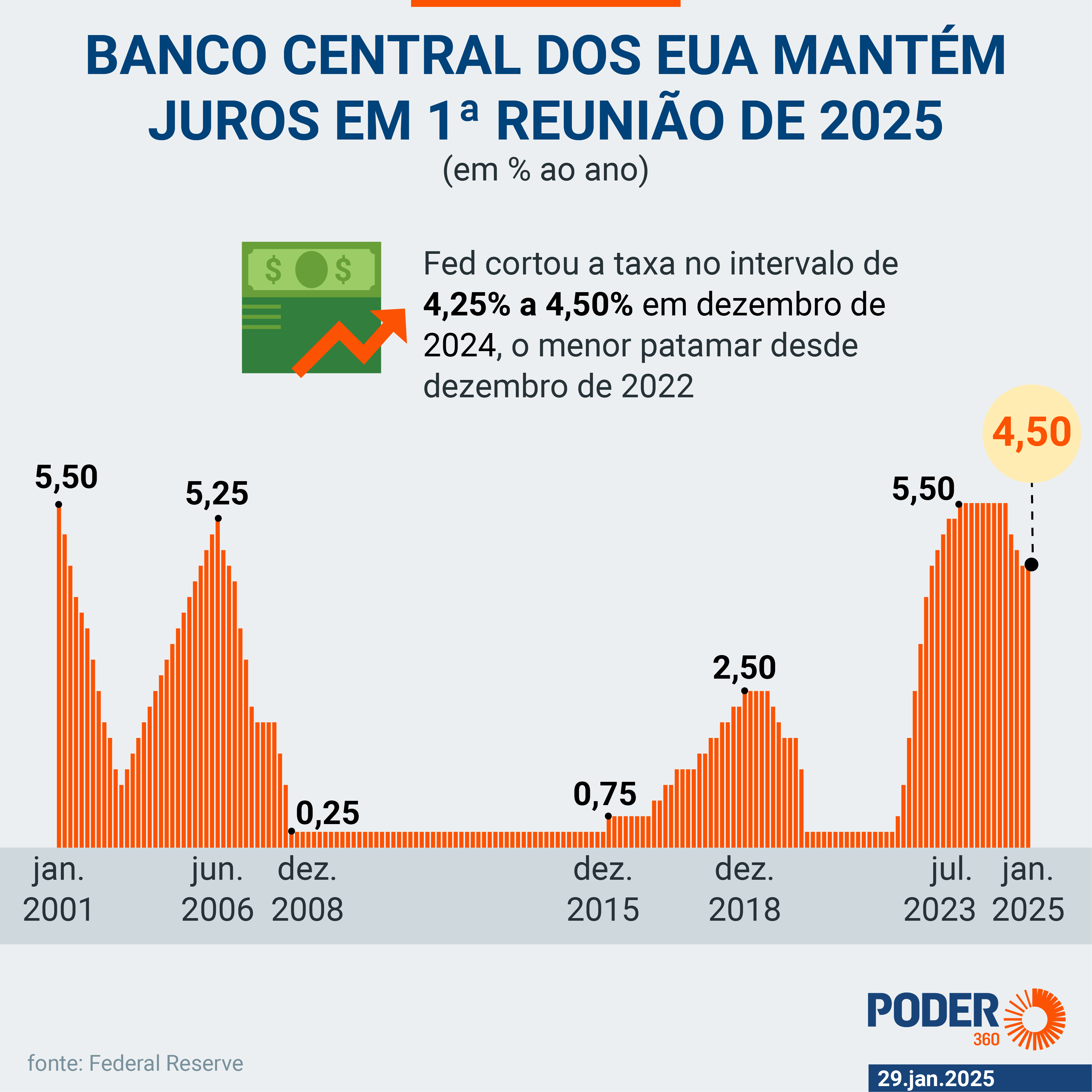 O presidente dos Estados Unidos, Donald Trump (Partido Republicano), criticou nesta 4ª feira (29.jan.2025) o presidente do Fed (Federal Reserve), Jerome Powell, por não diminuir as taxas de juros norte-americanas. O Banco Central dos EUA manteve o patamar de 4,25% a 4,50% ao ano.