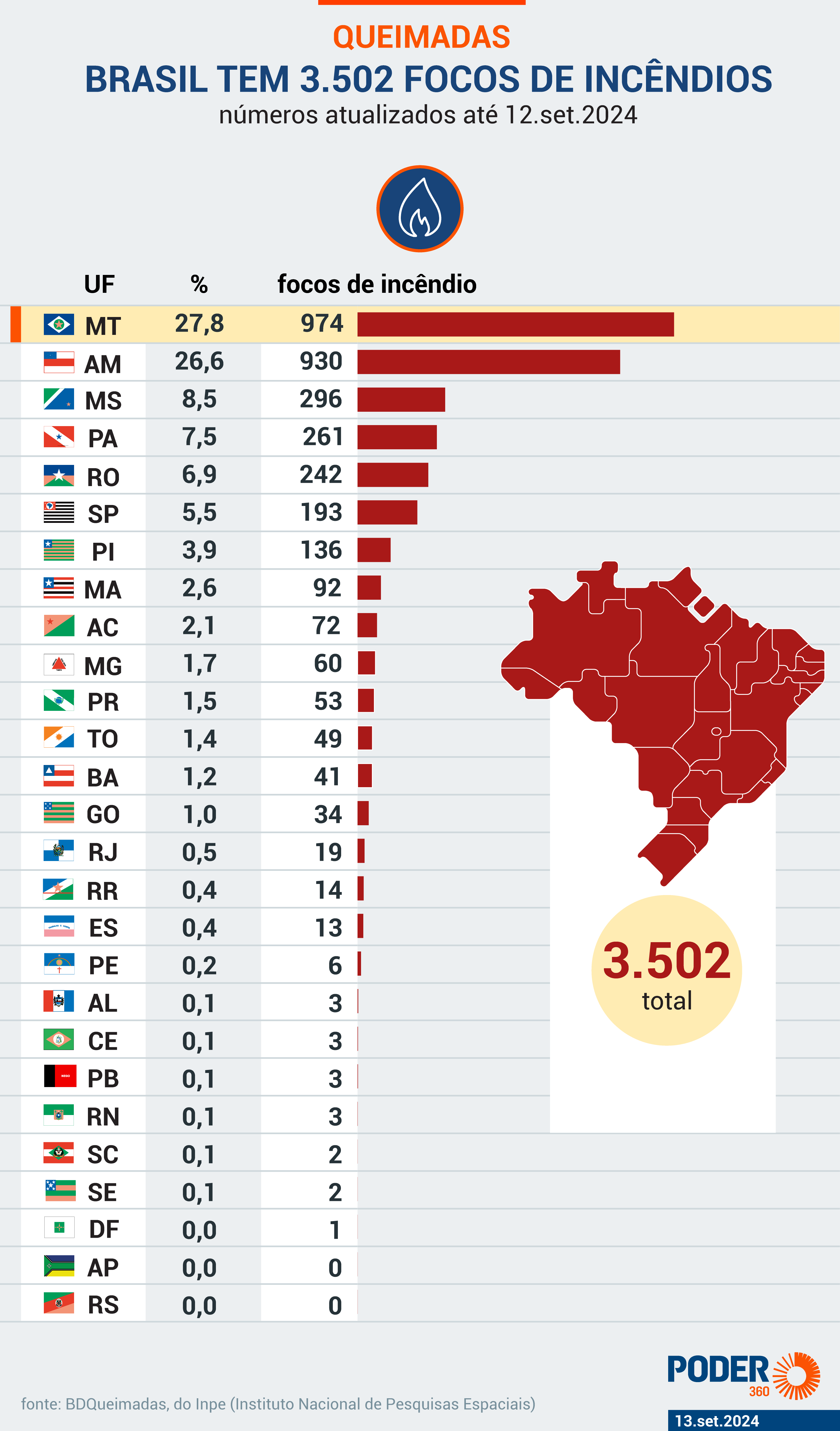 O Brasil registrou 3.502 focos de incêndio na 5ª feira (12.set), segundo dados do sistema BDQueimadas do Inpe. A Amazônia concentra a maior parcela das ocorrências, com 1.797 –ou 51,3%.